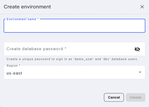 • In the console, select “create new environment.” Take note of your host and password and the username and database, which will also be needed to set up your server later, default to demo_user in ClearScape Analytics® Experience.