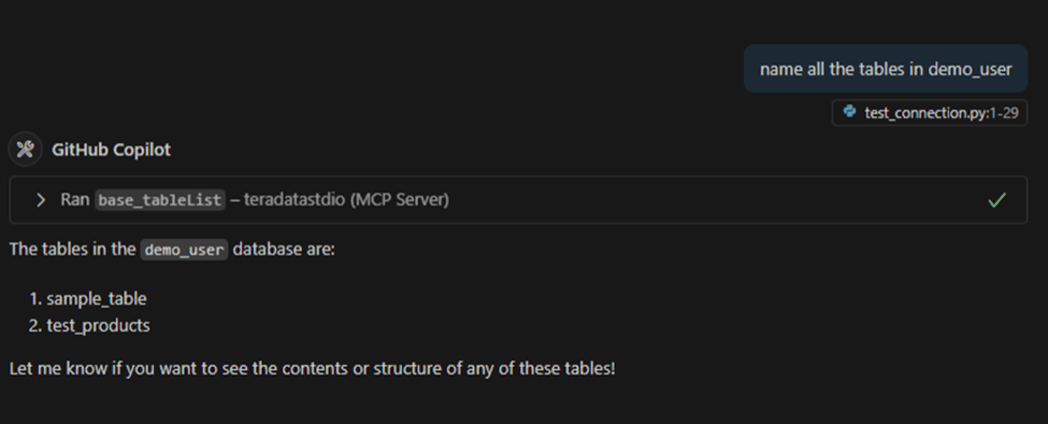 By combining Teradata’s MCP Server with GitHub Copilot Chat in Visual Studio Code, we unlock a powerful way to make data feel more conversational, accessible, and integrated into the daily developer workflow.
