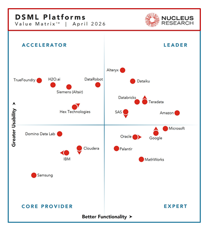 Teradata (NYSE: TDC) today announced it has been named a Leader in the Nucleus Research 2026 Data Science and Machine Learning (DSML) Platform Technology Value Matrix, published April 7, 2026. The annual Value Matrix evaluates DSML platforms across both functionality and usability, and the Leader quadrant recognizes vendors that deliver the highest combined value to enterprise customers.